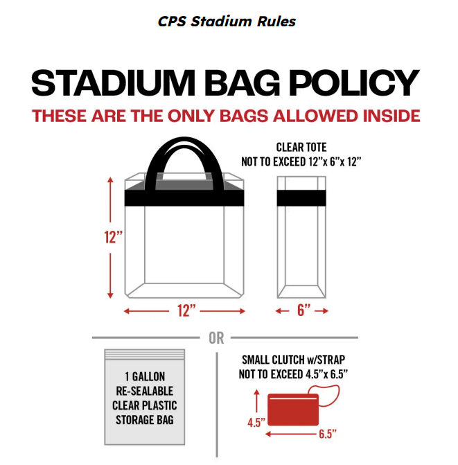 ● Clear Bag Policy All bags are subject to search upon entry. Backpacks and oversized bags are NOT permitted. Only small bags/clutch (no larger than 4.5” x 6.5”), clear plastic, vinyl, or PVC bags will be permitted. To expedite entry, guests are encouraged to bring only essential items.