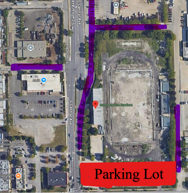 Here is a map for overflow parking on the street if the parking lot is full. The area just south of the stadium is a small parking lot in red. The purple areas are where you can park on the street.